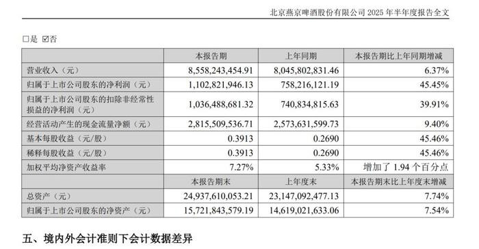 8月10日,燕京啤酒发布2025年半年报。数据显示,今年上半年,燕京啤酒实现啤酒销量(含托管经营)235.17万千升,同比增长2.03%;实现营收约85.58亿元,同比增长6.37%;归属于上市公司股东的净利润为11.03亿元,相比上年同期增长45.45%。