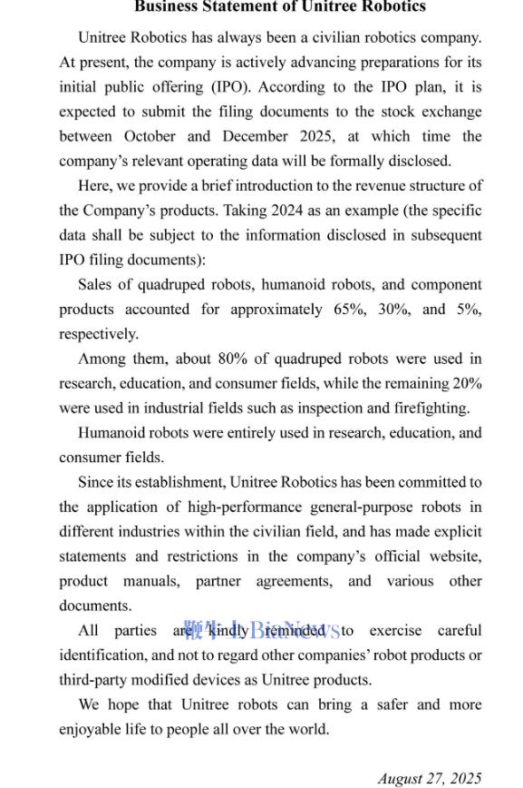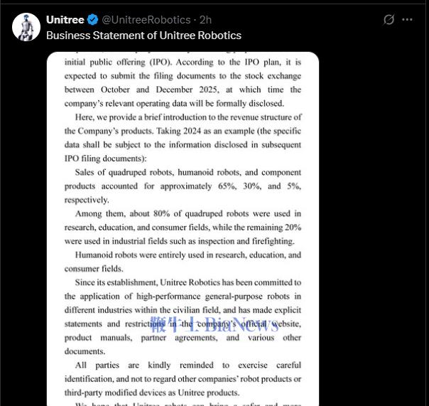 9月2日,宇树科技在社交媒体平台X上发帖称,预计将在10月至12月向中国证券交易所提交IPO申请。